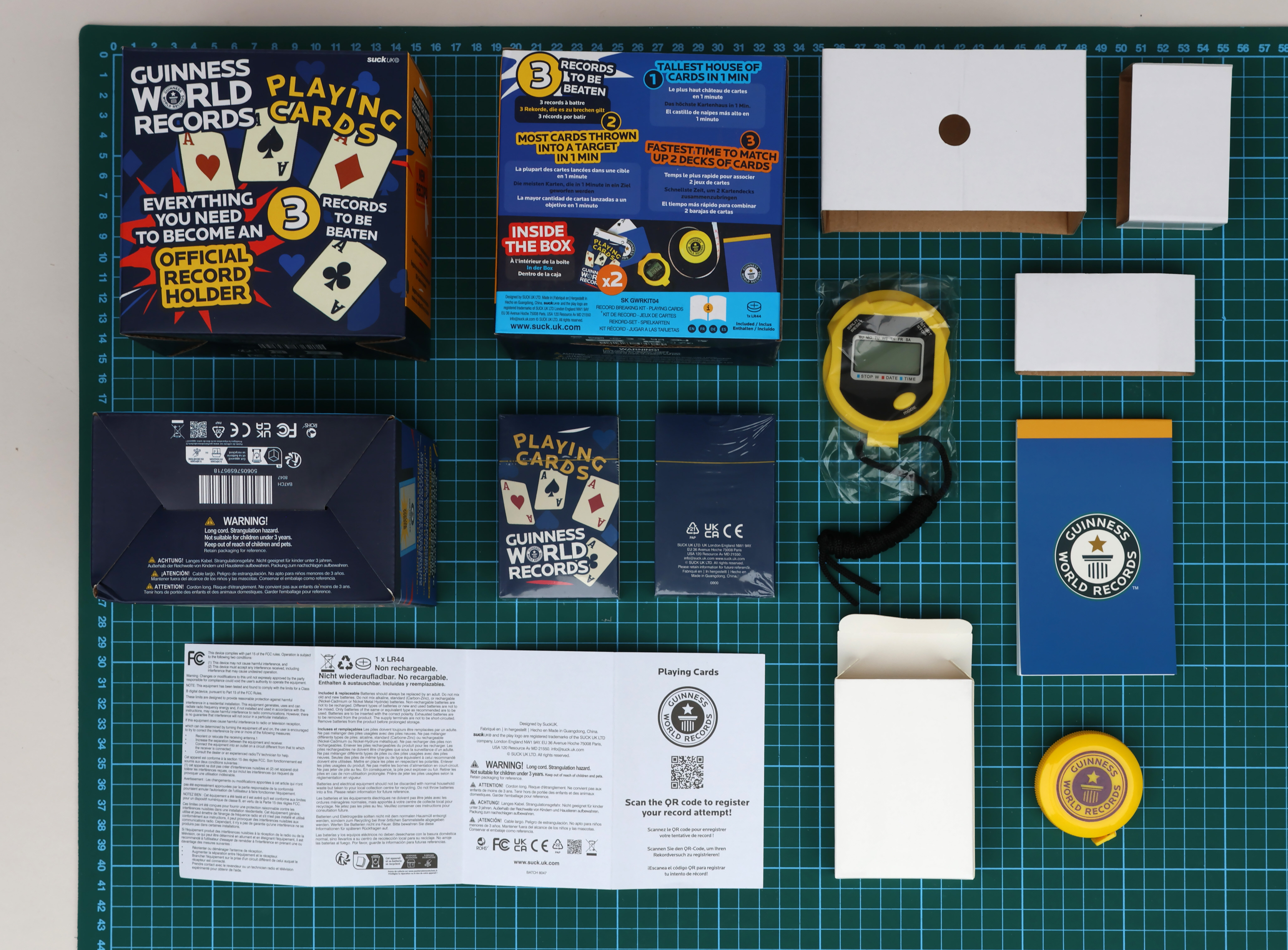 - Includes two decks of playing cards, stopwatch, tape measure, scorepad and printed instructions