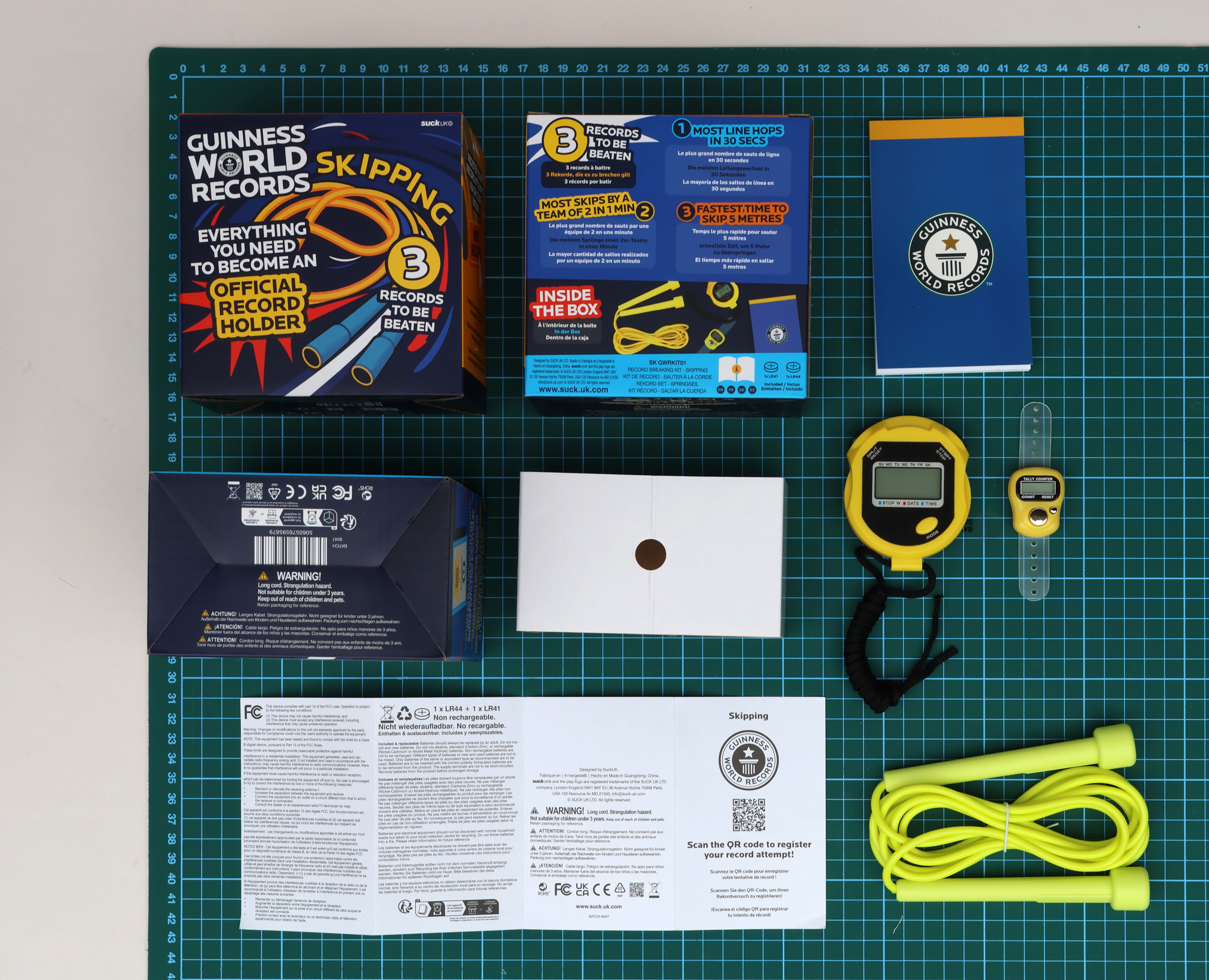 - Includes skipping rope, stopwatch, tally counter, scorepad and printed instructions