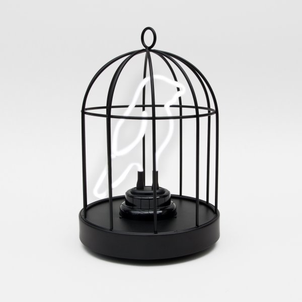 This self-contained lamp comprises a white neon tube in the shape of a bird, perched inside a simple black metal cage that can be hung from the ceiling or placed on a table. The bird is 6” tall and adds a fresh white glow to any space. Traditionally neon lights have been the preserve of bars & nightclubs, but new technology brings cold cathode to your home, conveniently powered by 4 AAA batteries or USB (2m cable included). All the pleasures of owning a pet bird with added convenience of an on-off switch and no need for feeding or cleaning up bird poop.