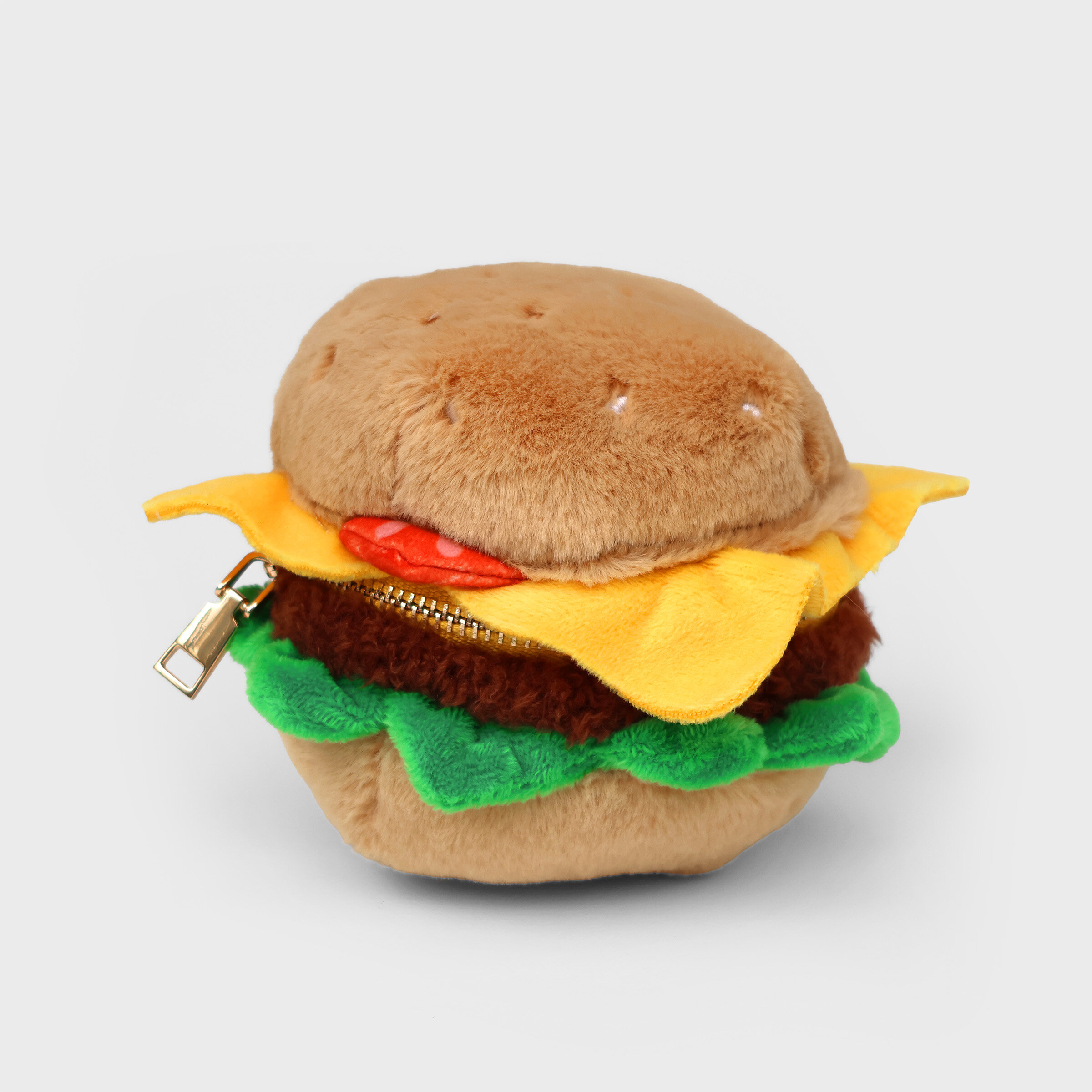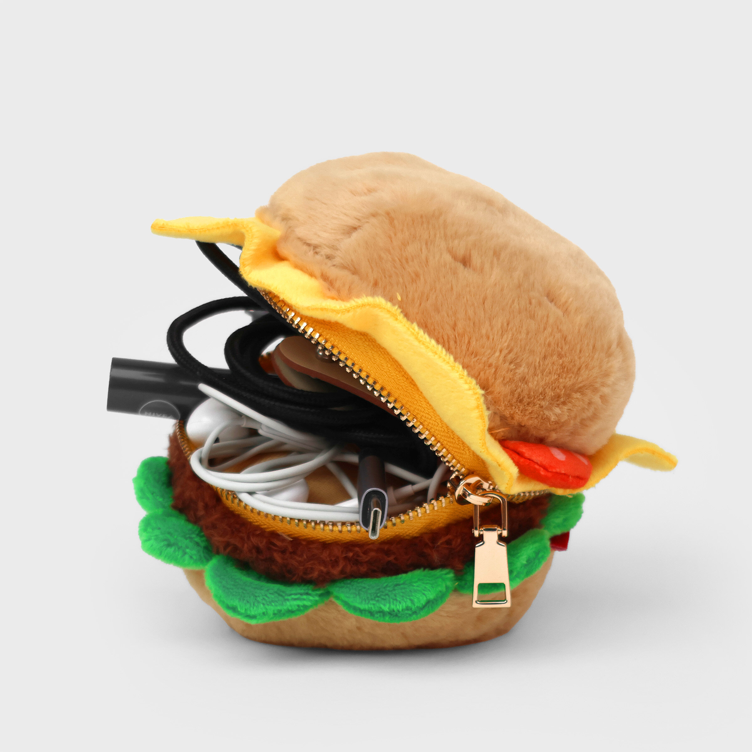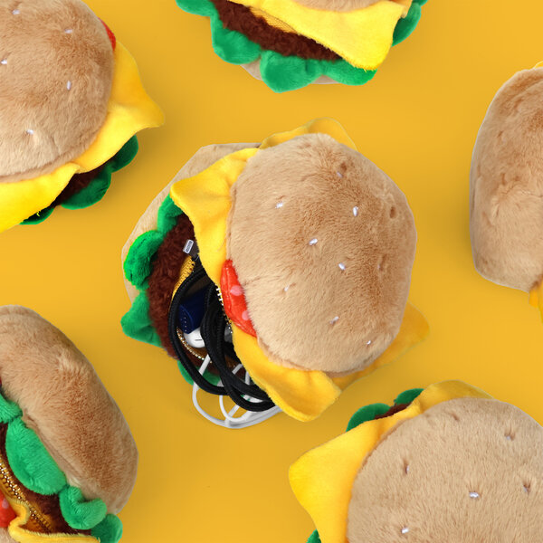 Plush burger shaped case with gold zip. Store your belongings amongst the salad and the melted cheese. Yum!