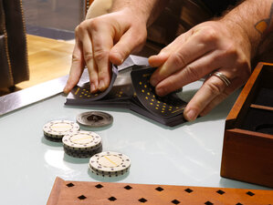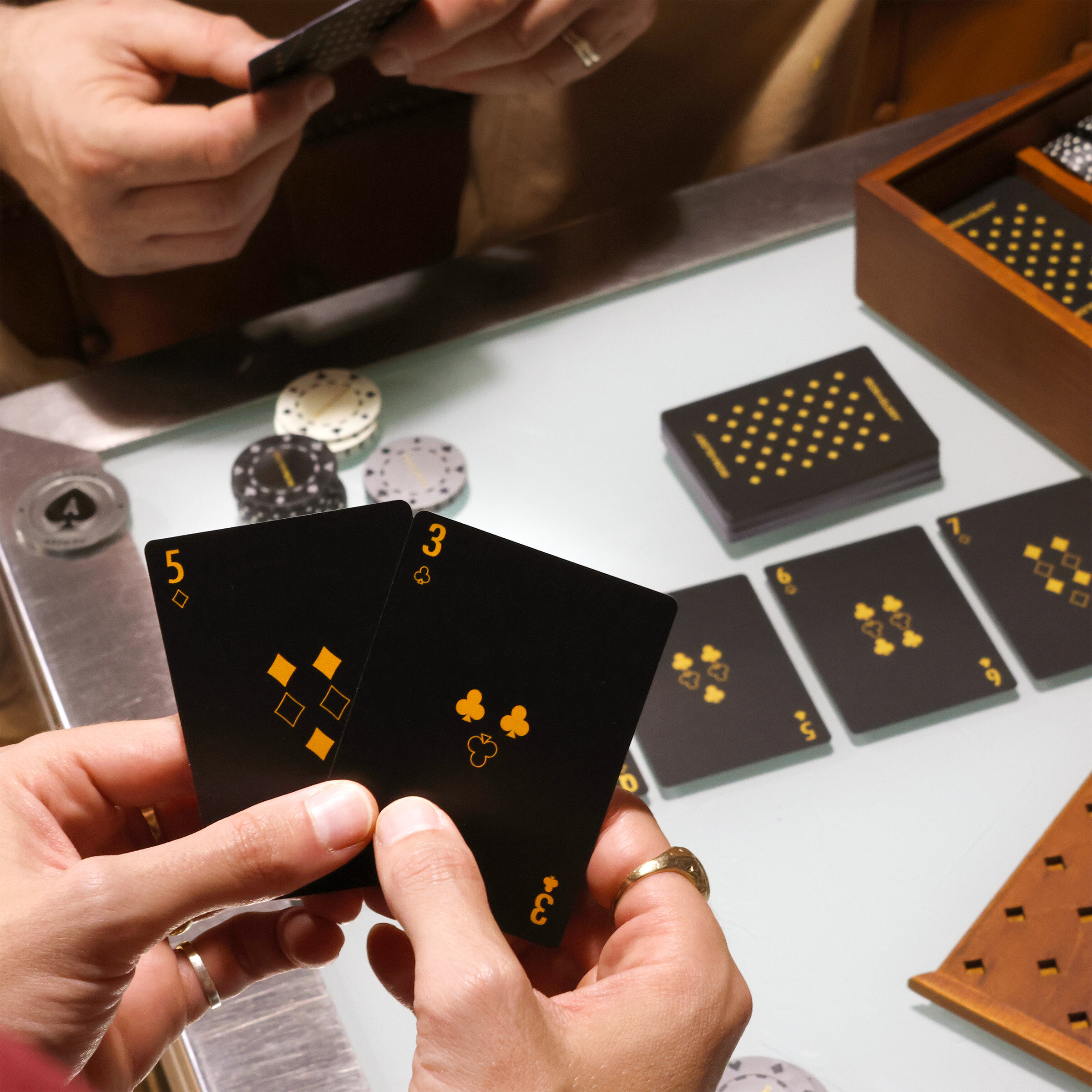 Deluxe wooden presentation box with playing cards, 100 custom poker chips and metal dealer chip. For the more discerning card shark.