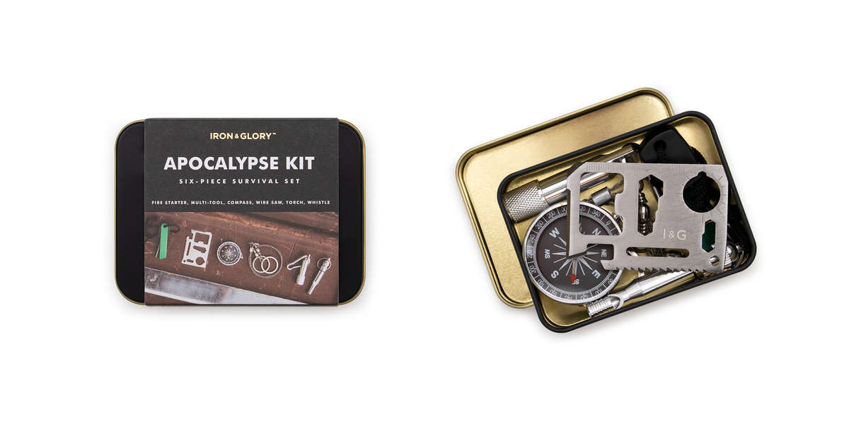 Five piece survival kit, including multi-tool, wire saw, compass, key ring whistle and torch.