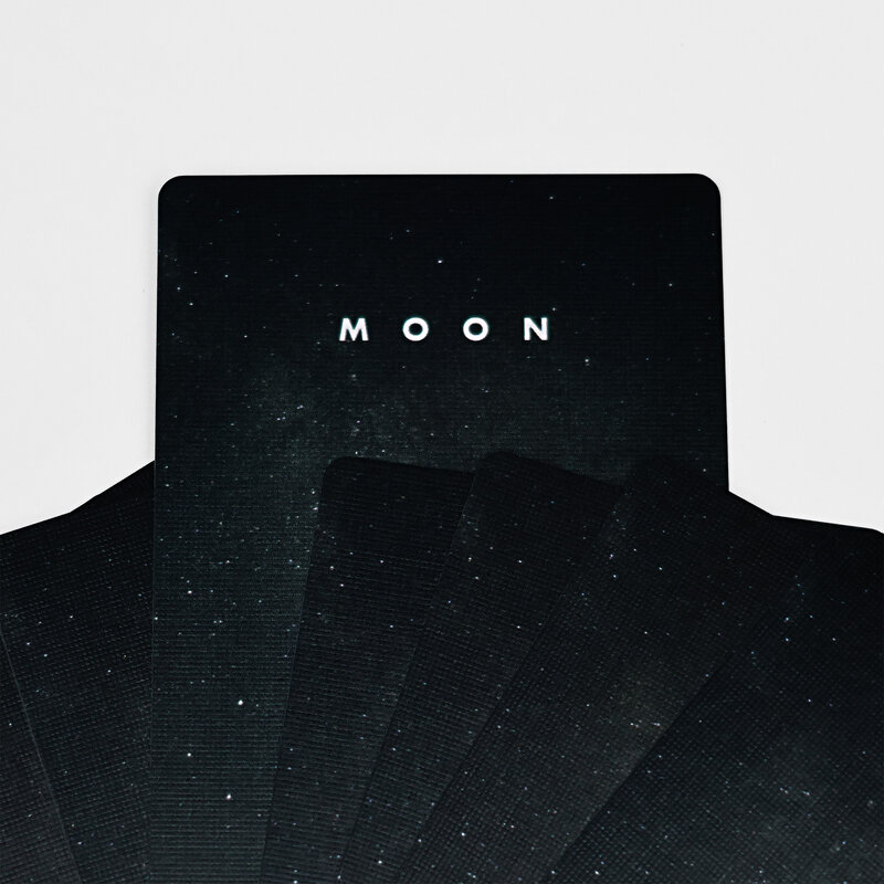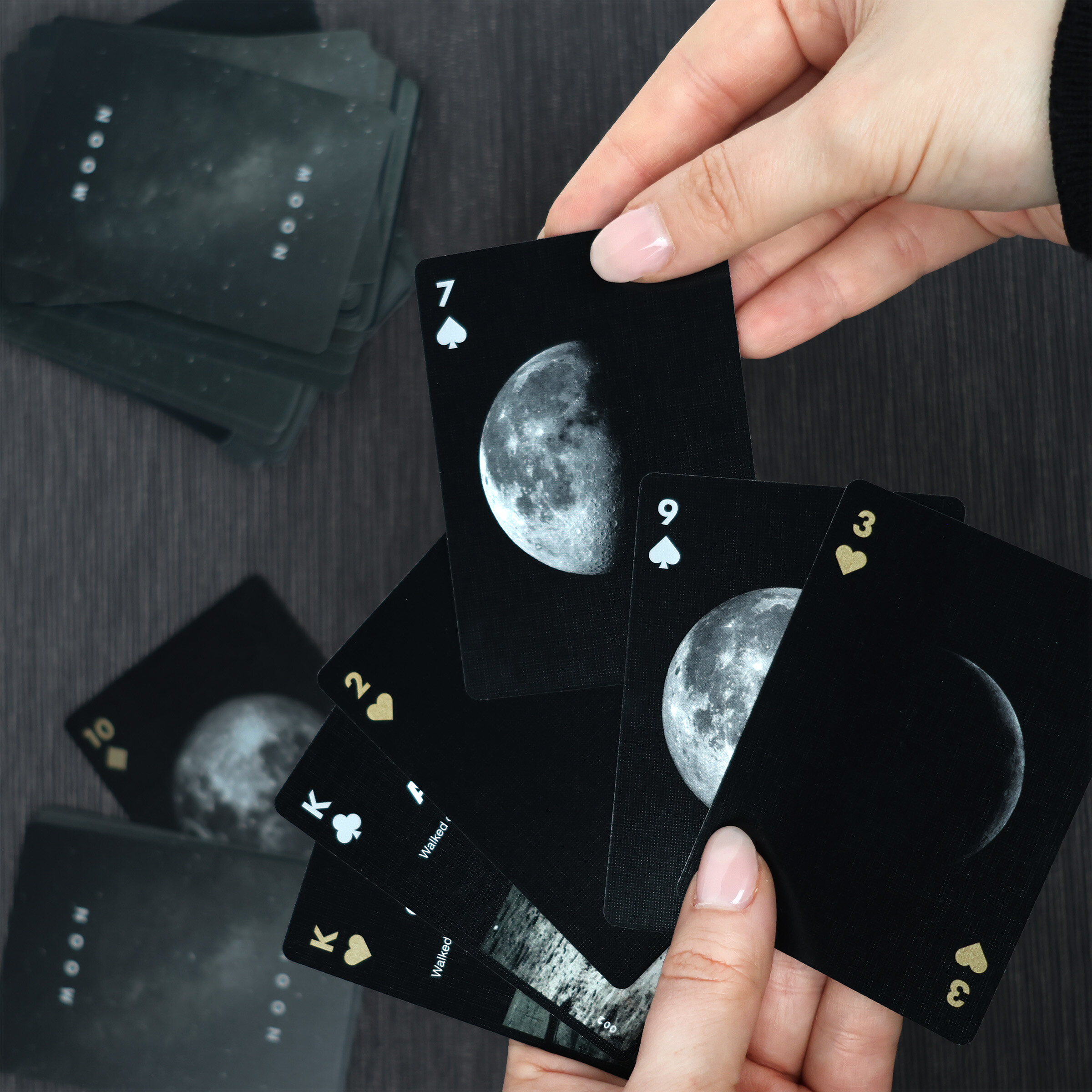 A deck of black moon-themed playing cards. The number cards feature the phases of the moon and the Jack, Queen and King cards celebrate all 12 Nasa astronauts who set foot on the moon during the Apollo moon missions.