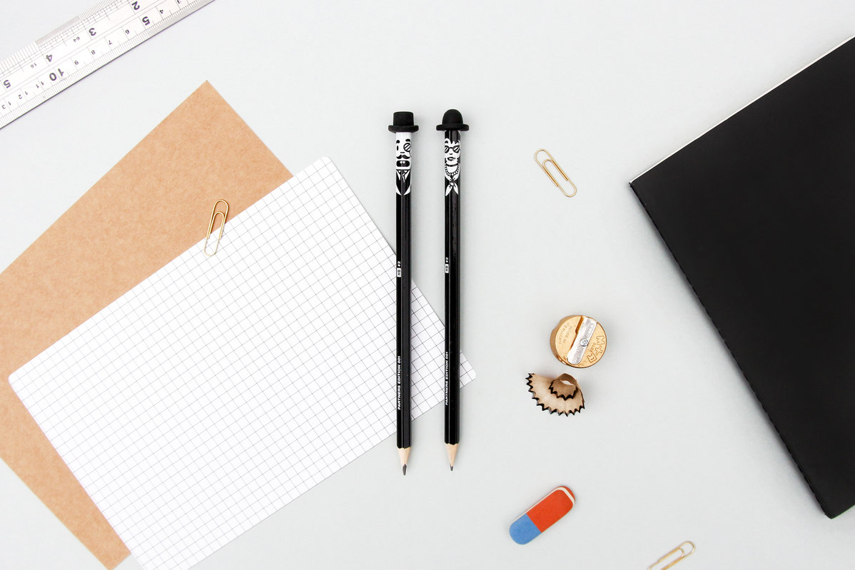 A set of two pencils with detachable eraser hats. These characterful pencils will add some serious style to your pencil case. Smartly dressed stationery in even smarter packaging.