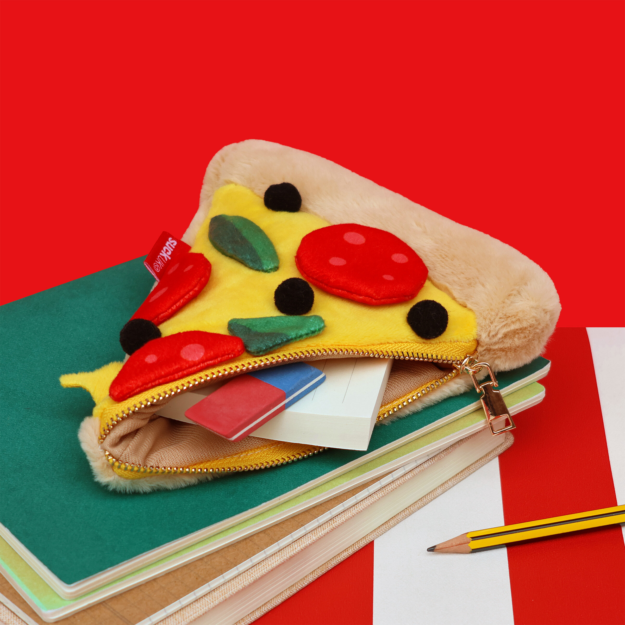 Plush pizza shaped case with gold zip. Store your belongings in style by tucking them into this slice of delicious pizza. Yum!