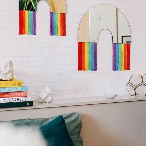 Fresh and contemporary wall mirror with colorful fabric fringes dripping from the rainbow.