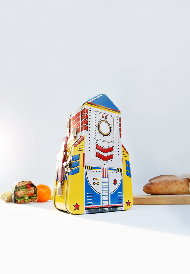 Keep snacks safe while jetting around. A classic tin lunchbox in a retro rocket design. Big enough to hold a complete packed lunch, cool enough to stay out of your school bag. The best gift for budding young astronauts or big kids.