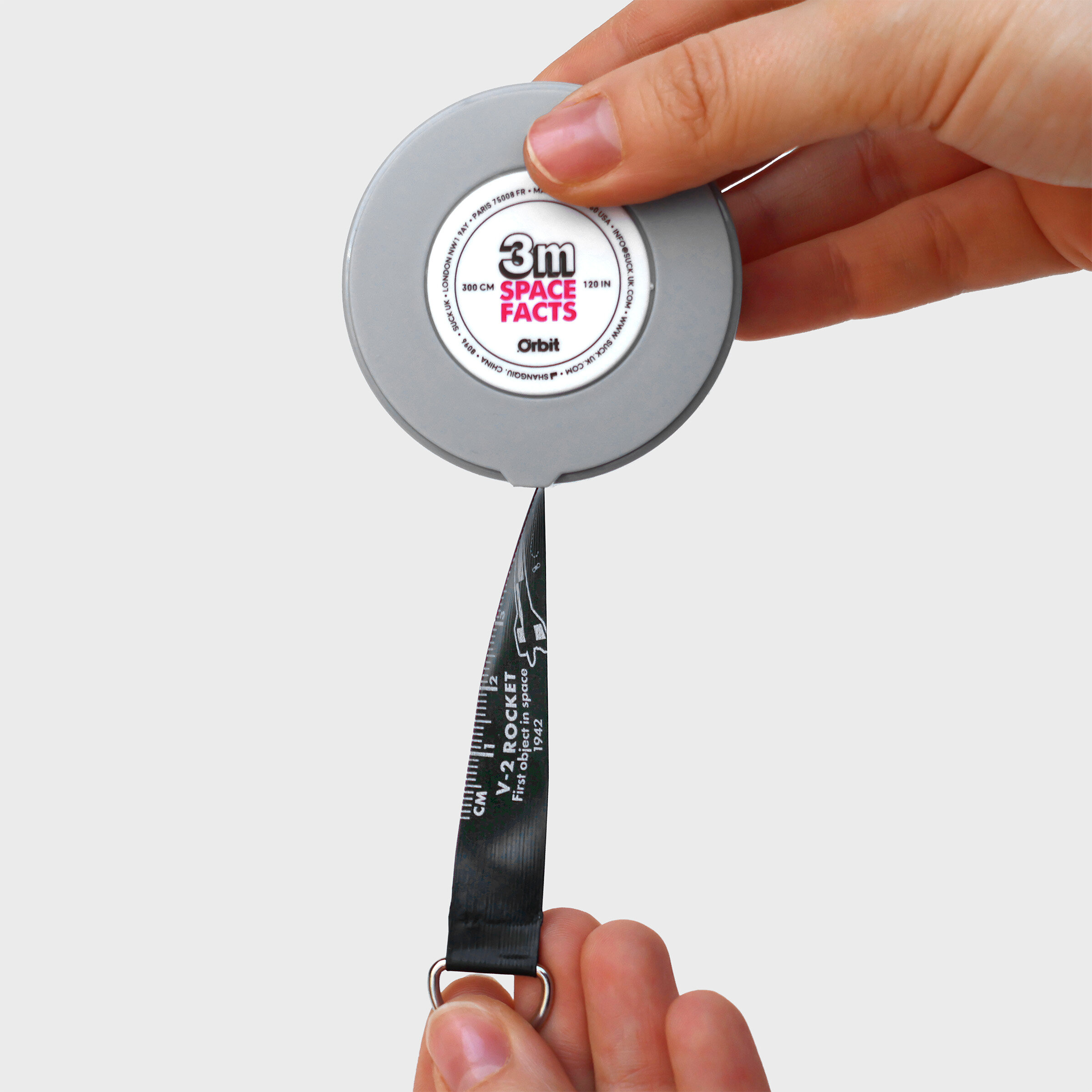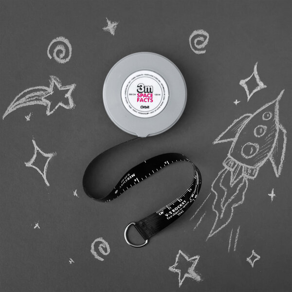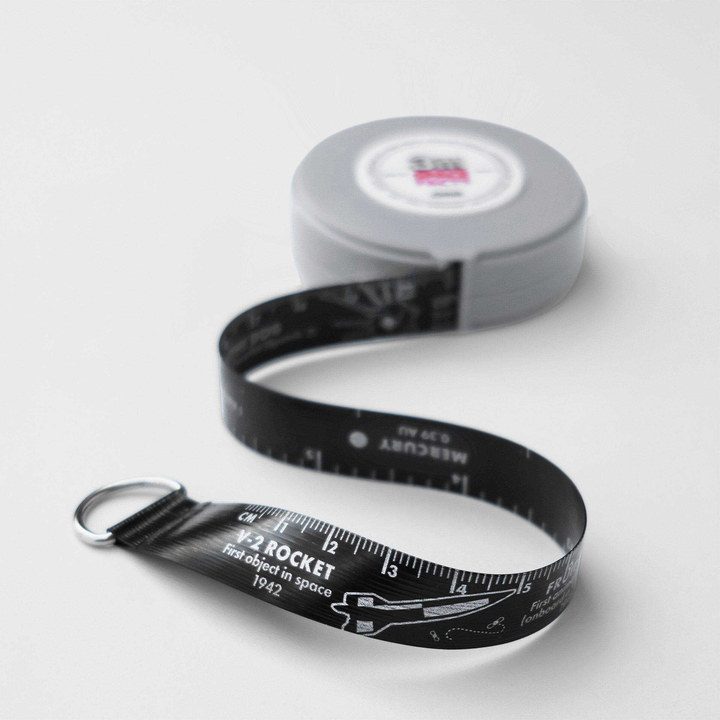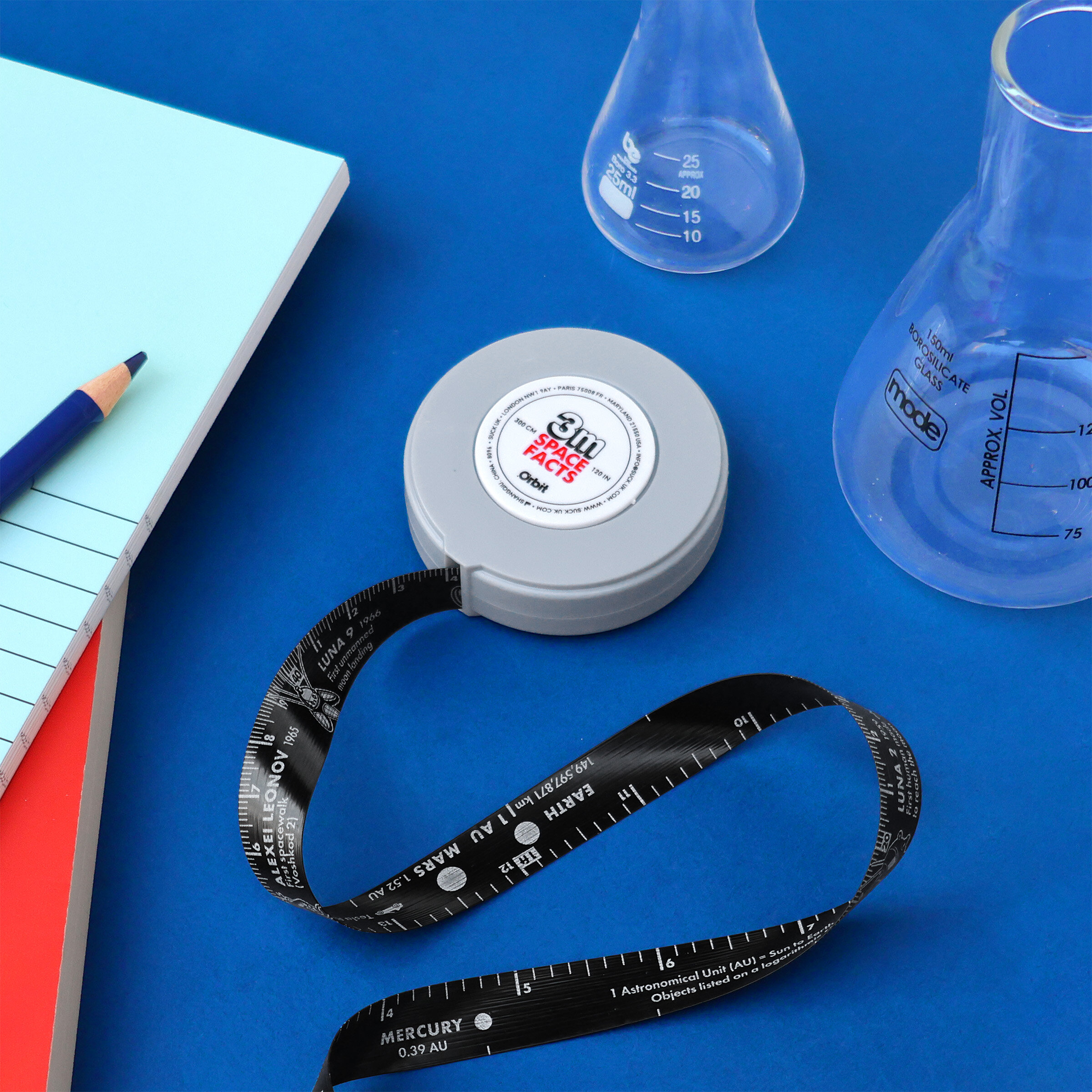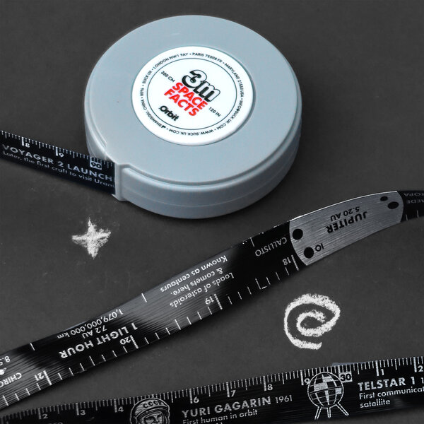 Double sided, auto locking, measuring tape with fascinating facts from outer space. Comparative distances of celastial objects from man made space junk to distant black holes. Plus a history of human space exlporaion. A great gift for inquisitive kids and geeky grown-ups (or anyone who needs a tape measure). 60 facts from the scientific to the ridiculous in cm & inches.