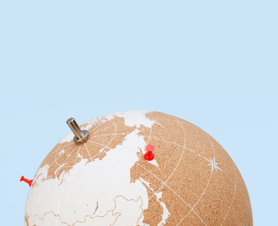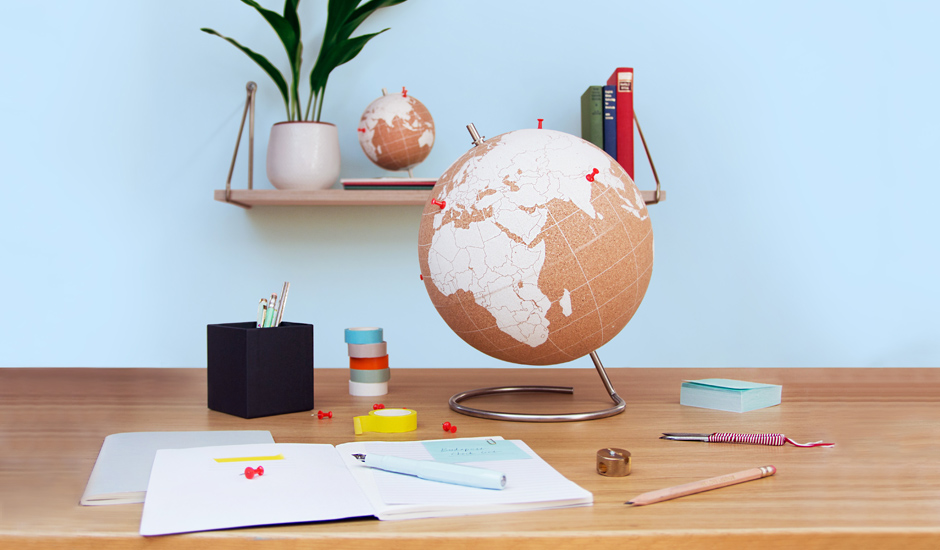 Our classic Cork Globe with a new white print. Stick pins in the places you’ve been or plan your future travels. Mounted on a stainless steel base and supplied with a set of red pins, our unique globe is available in large 10" (Ø 25cm) and mini 5.5" (Ø 14cm). The perfect gift for adventurous friends.