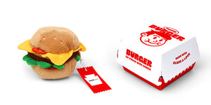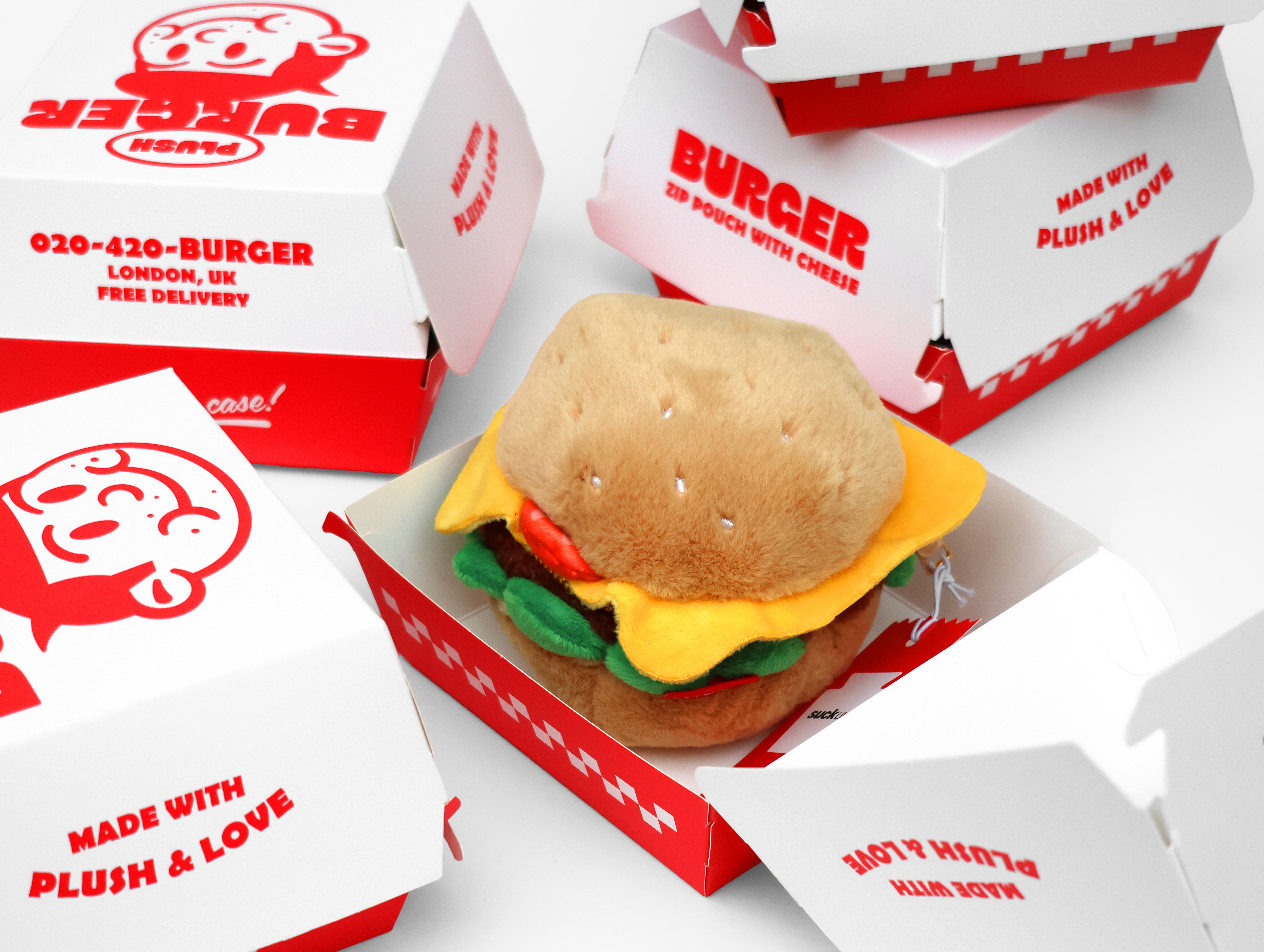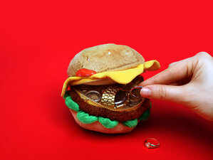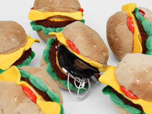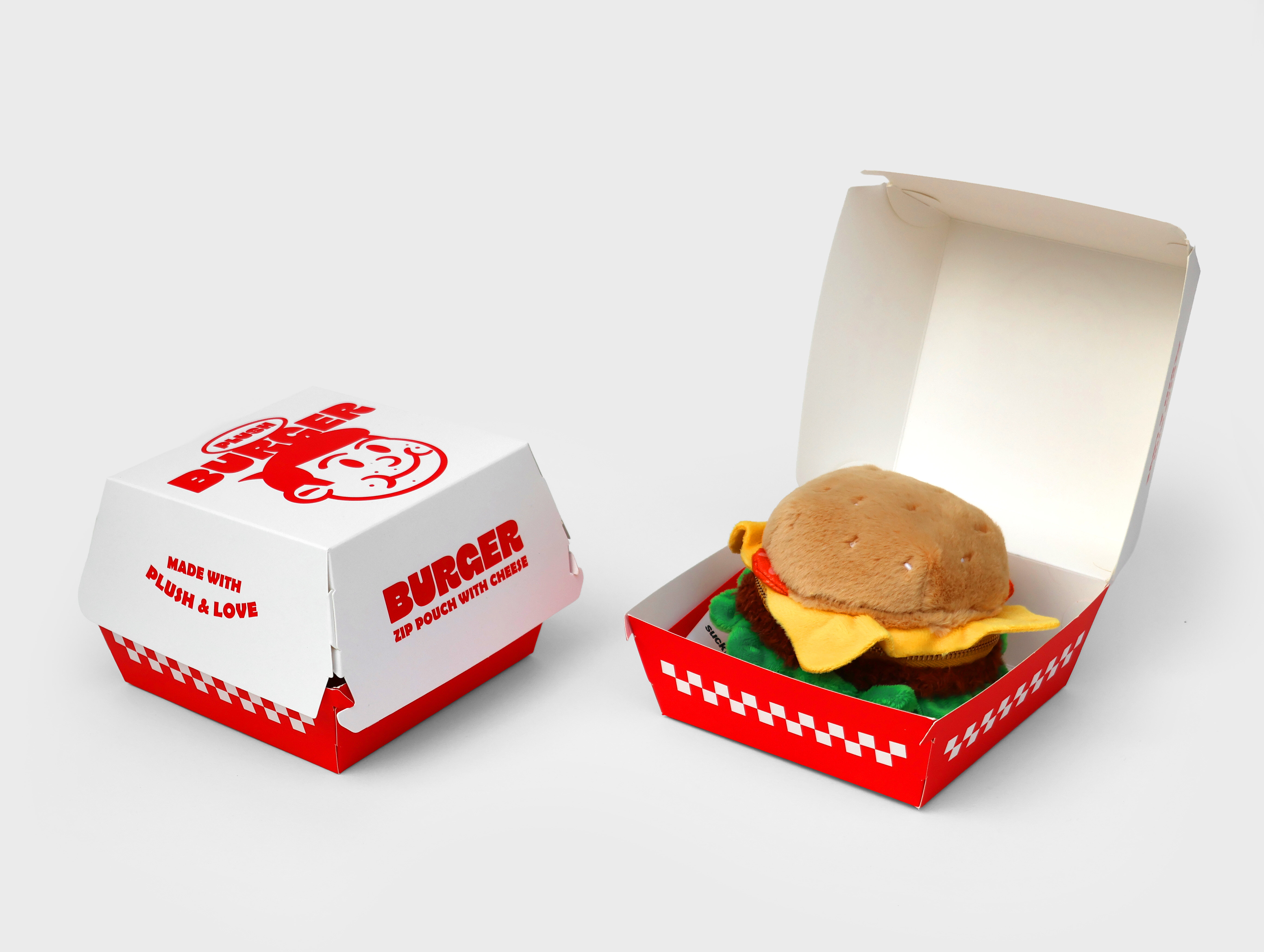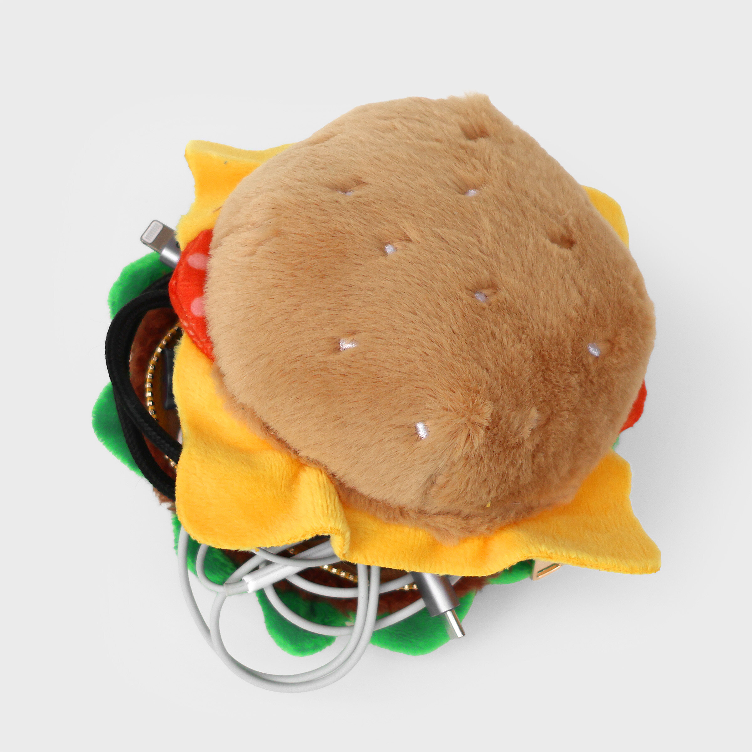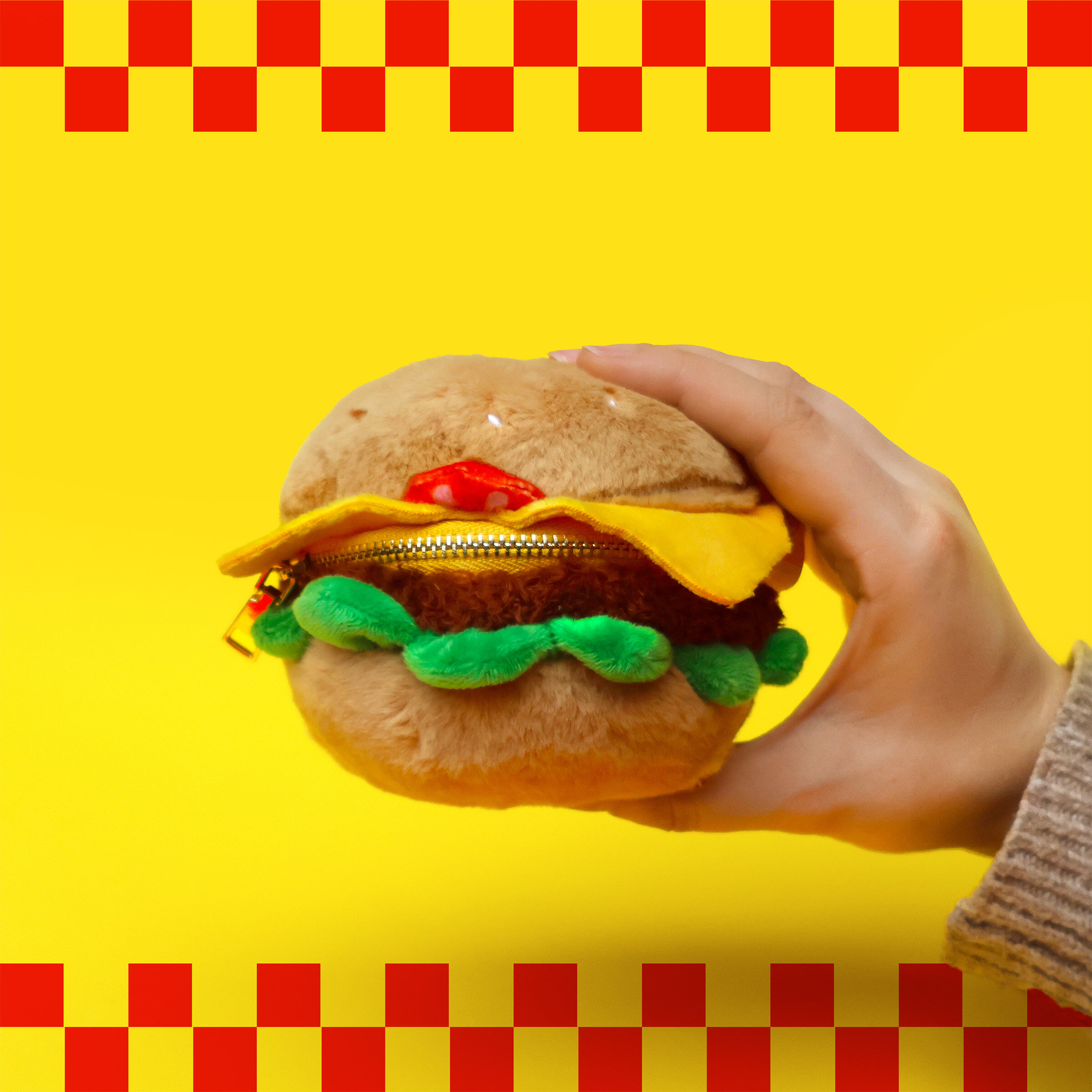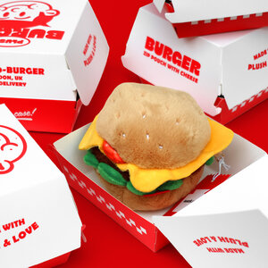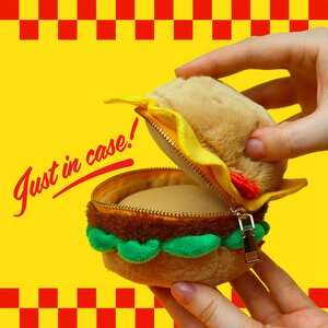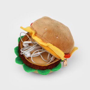 Plush burger shaped case with gold zip. Store your belongings amongst the salad and the melted cheese. Yum!