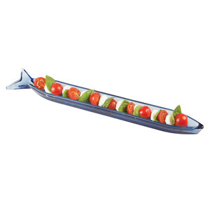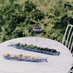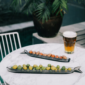 Mediterranean-style lengthened glass bowl shaped as a fish. A different way to serve your appetizers like olives, cherry tomatoes, cheese cubes, etc.