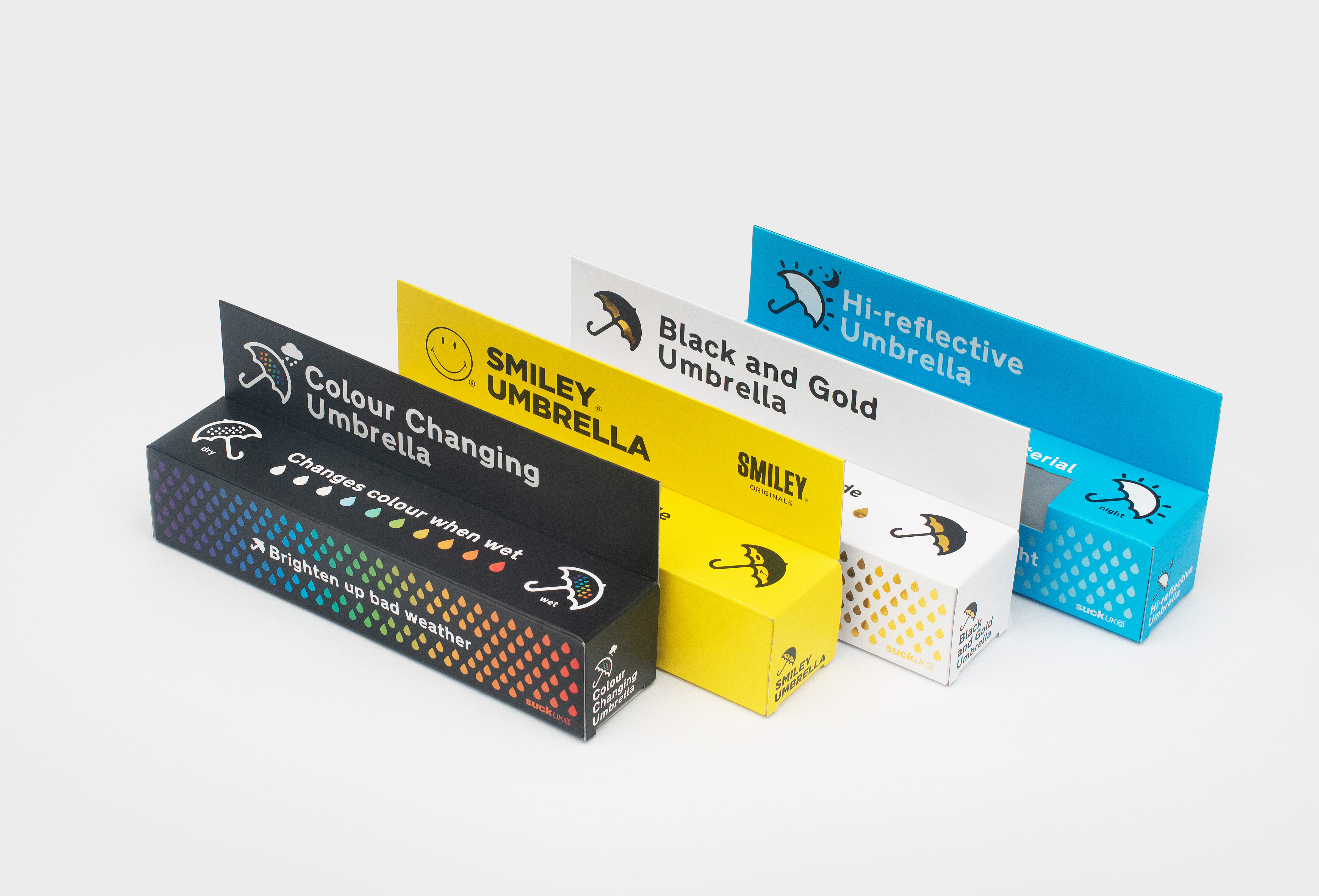 Brighten Up Bad Weather. Simple white raindrop pattern transforms into a rainbow burst of colour when the umbrella gets wet. Printed with special ink, that comes to life when in contact with water. Confuse a generation of children into thinking rainbows are leaking colour from the sky.