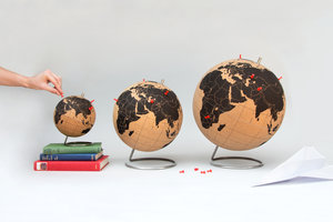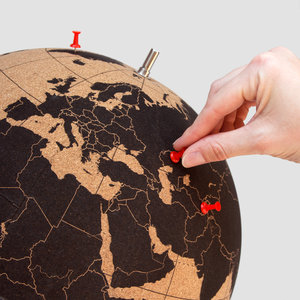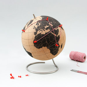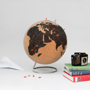 Stick pins in the places you’ve been or plan your future travels. Cork Globe printed with a clear and simple world map: pinpoint cities and tick-off countries as you journey around the planet. Mounted on a stainless steel base and supplied with pins. Been there? Done that? Show off your globetrotting exploits for all to see. Choose between Standard 10” (Ø 25cm), Small 5.5" (Ø 14cm) or XL 12.5" (Ø 32cm)