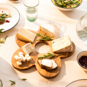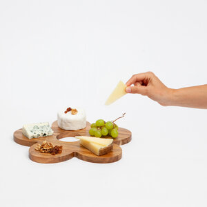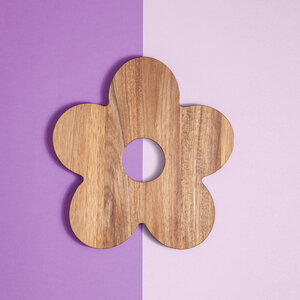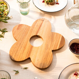Daisy-shaped cutting and serving board, made of engraved wood.