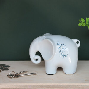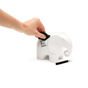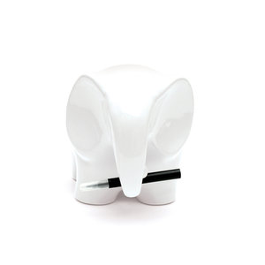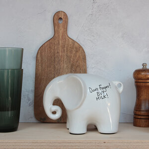 Eric is not your average Elephant… firstly he is made of smooth white ceramic, secondly he just loves to be written on. If anyone’s ever written on you, you’ll know it tickles and is hard to get off – us humans are not made to be marked with millions of memos. Eric however wants to help you keep track of all those things you need to remember but keep forgetting, or stuff you need to let your housemate know but you’re never in at the same time. What ever you want to scribble, Eric is ready and waiting to oblige, after all he’ll never forget! That is until you wipe him clean and start again.