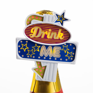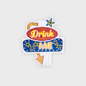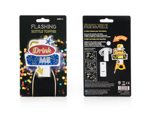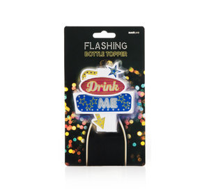 Bring a bottle with more sparkle… Add a flashing retro light display to your wine, champagne or tipple of choice. Fits on the neck of any bottle. Designed in the style of vintage era Vegas neon, flashing the encouraging message “Drink Me”. Activate the 45 second light display with the push button on the back. The letters are illuminated by LEDs and flash in sequence. Get the party started. Endlessly re-useable for many-many bottles of fun.