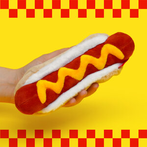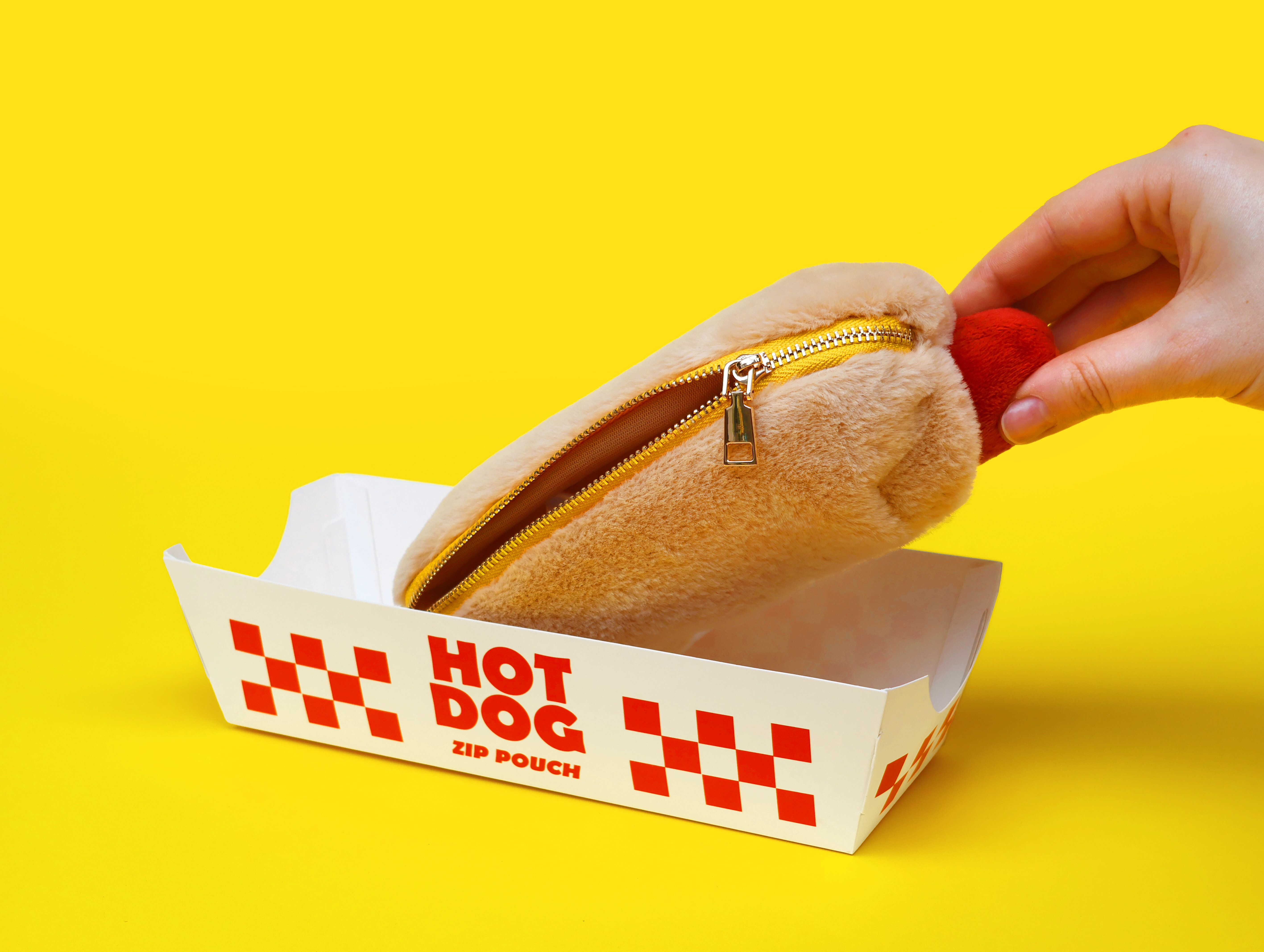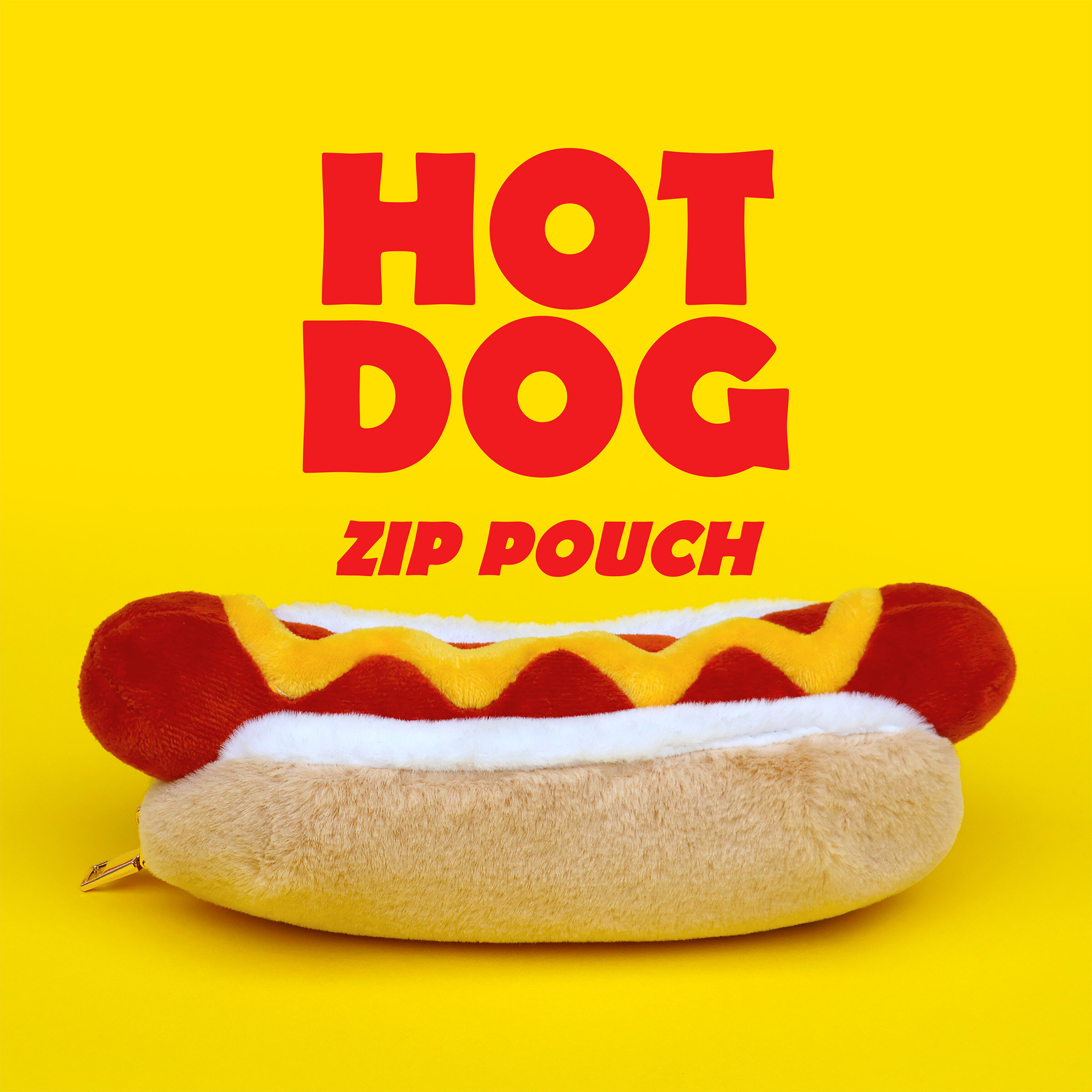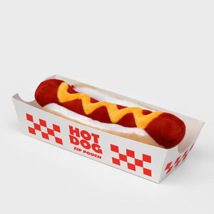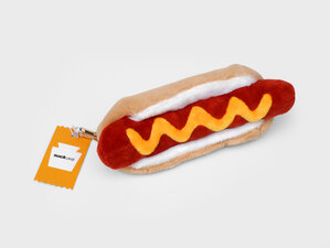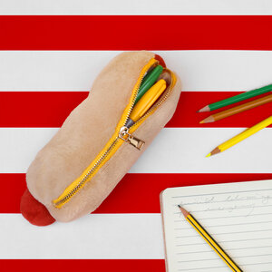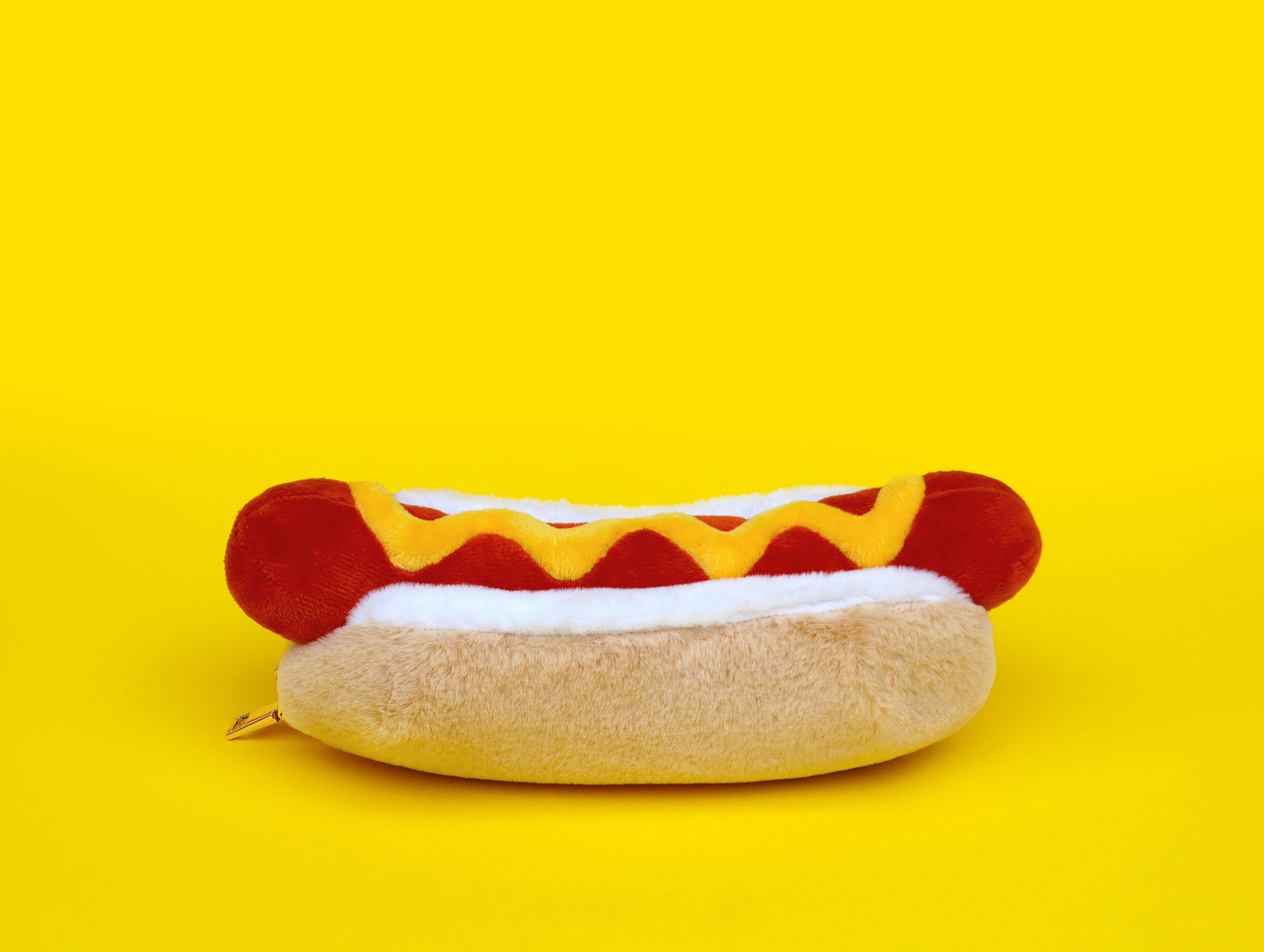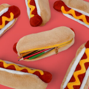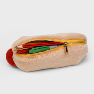 Plush hot dog shaped case with gold zip. Store your belongings in style by filling your hot dog bun full. Yum!