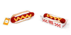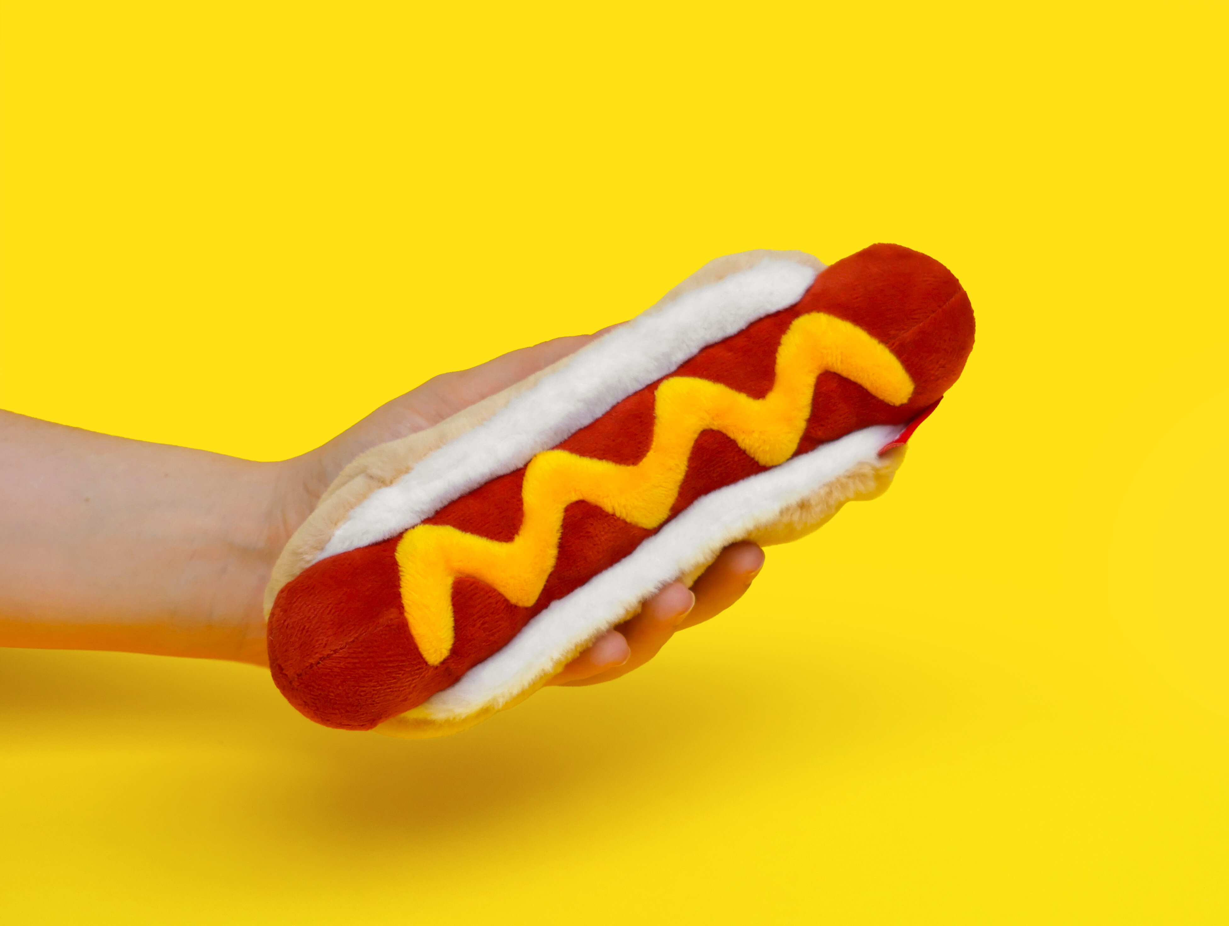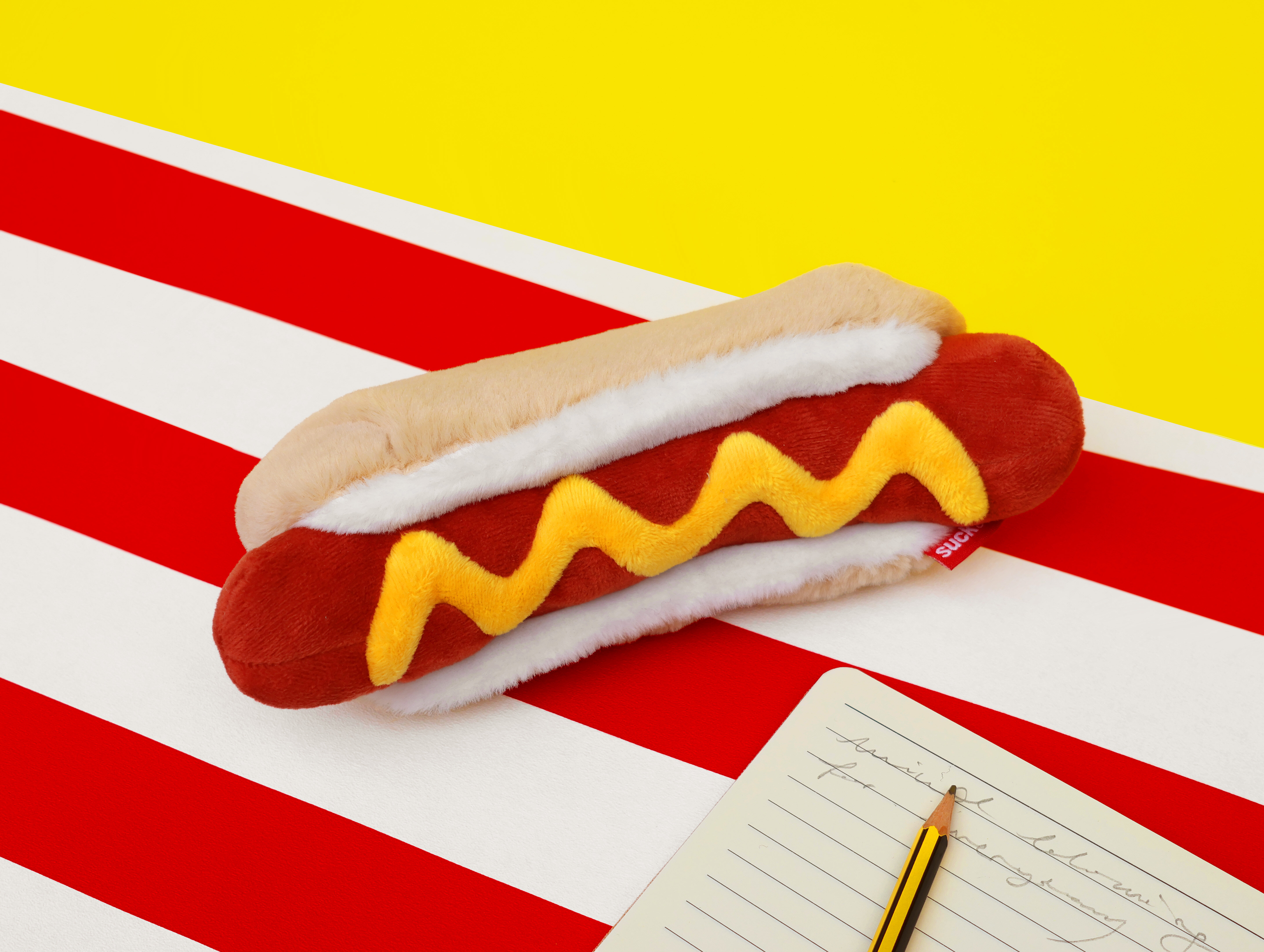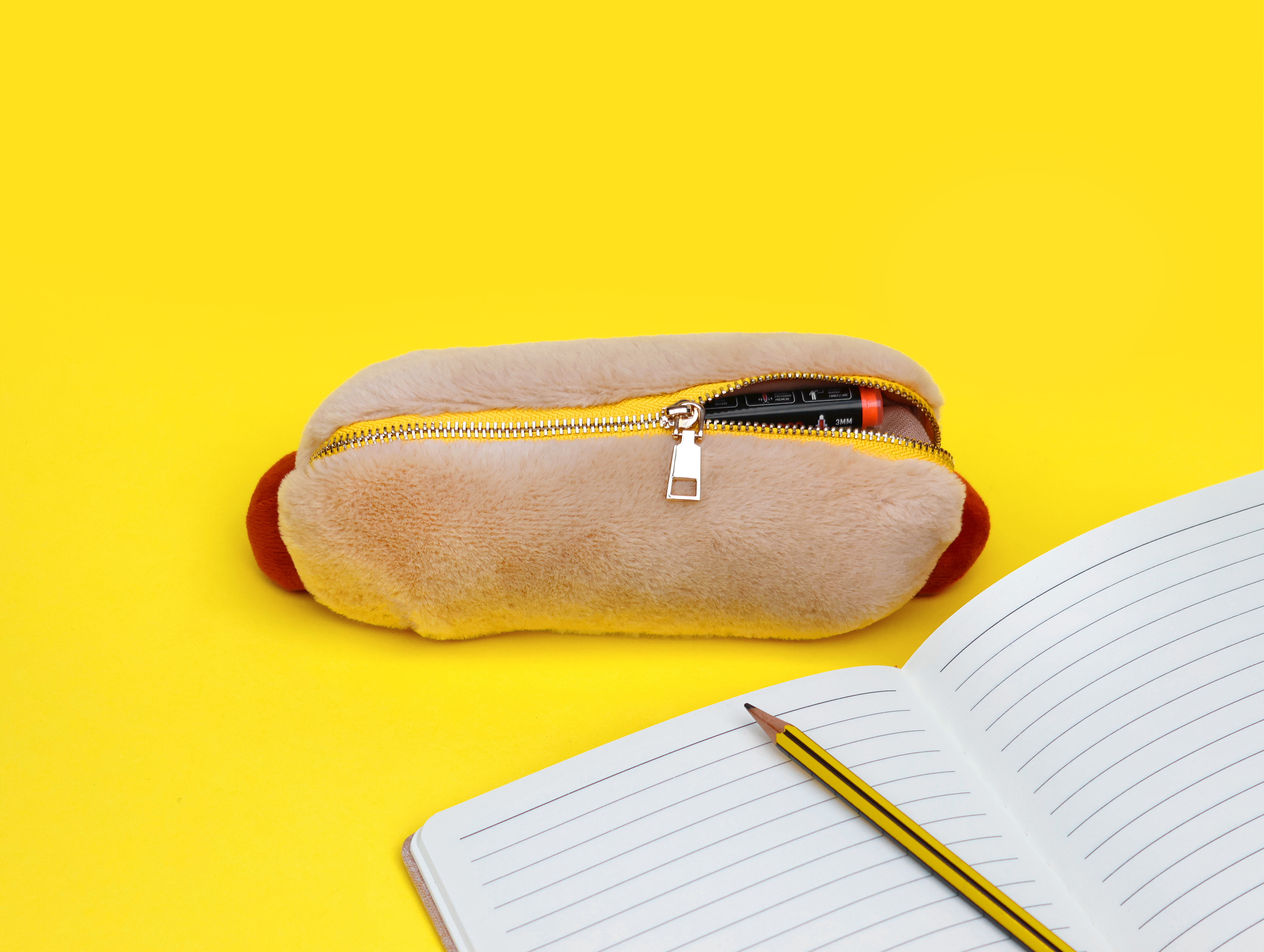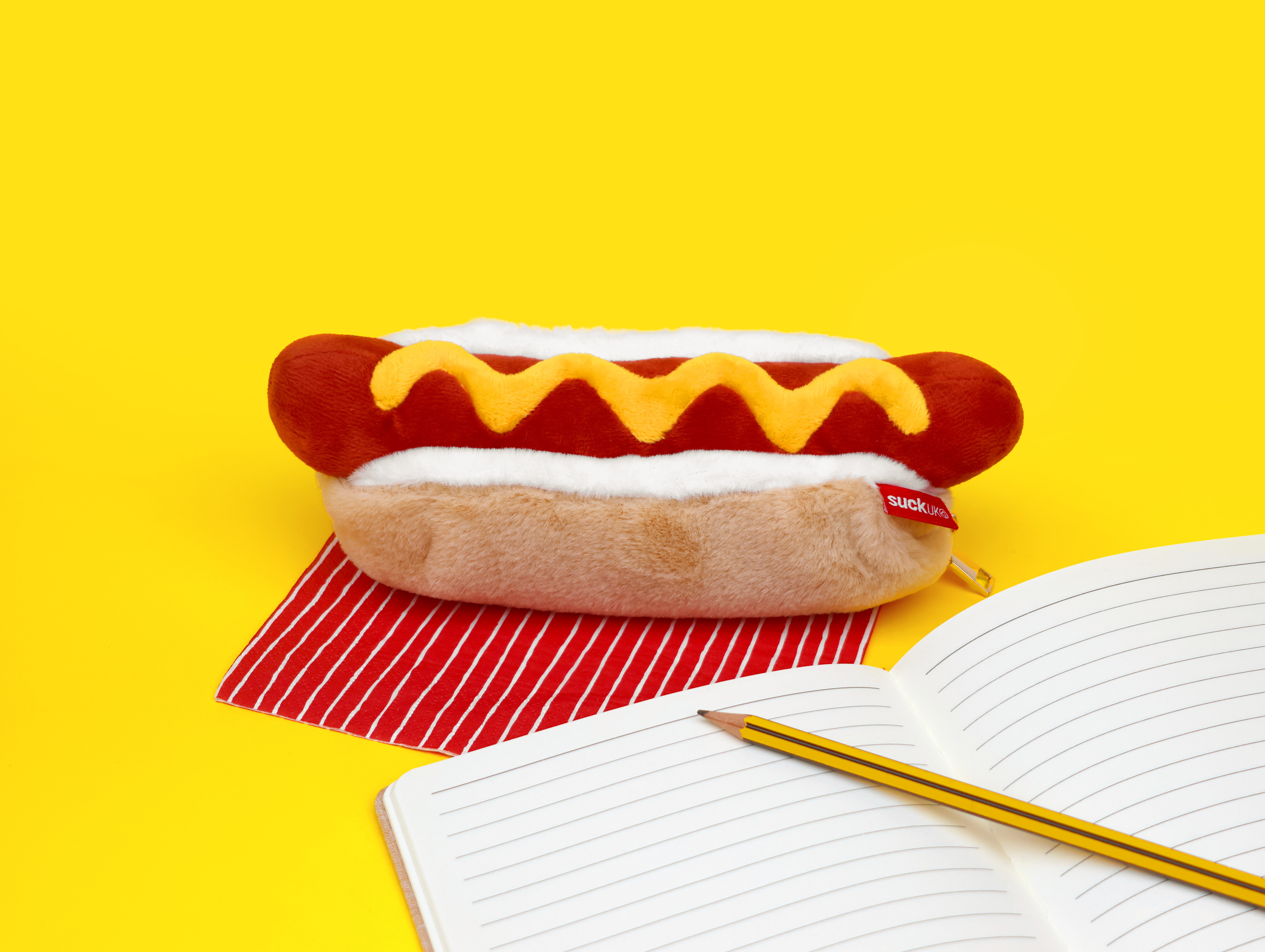Plush hot dog shaped case with gold zip. Store your belongings in style by filling your hot dog bun full. Yum!