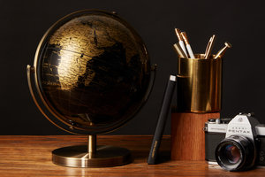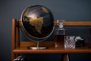 20cm (8") black and gold double axis globe with a brushed metal frame and base. Detailed country and city information clearly presented in a modern two colour layout. It’s a beauty!