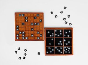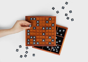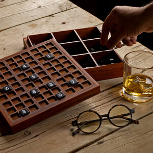 This extra-large, super deluxe wooden board includes 81 numbered tiles. The tiles are double sided, the reverse has non-printed embossed numbers to allow for pre-planning or trying a solution before you commit. Also inside the box comes instructions on how to play, puzzles and solutions. Perfect for absolute beginners or experience players.