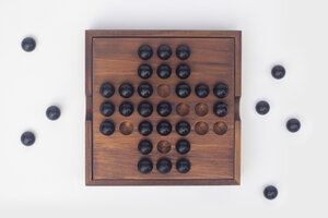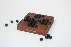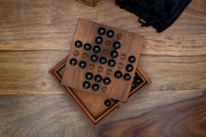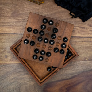 Solo Noble or Solitaire is an ancient and classic board game for one player. This deluxe wooden set includes 33 black glass marbles, the storage box lid doubles as the playing board. Solitaire is a hard to solve puzzle, with one aim, and many possible solutions. We have also included instructions for lesser known variations. Solving these easier variants will set you on the road to the ultimate solution. Good Luck!