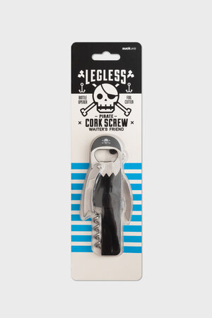 The sommelier’s favourite “Waiter’s Friend” corkscrew. Pull corks like a professional. Integrated easy-open lever, foil-cutter and beer bottle opener. Designed like a peg-legged pirate with eye-patch, beard, hook hand, earing, black bandana and even a parrot. Forget Blackbeard, “Legless” is the hardest working pirate in the bar. A great kitchen gift.