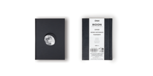 Simple, black, hardback notebook with a hole in the cover revealing an iconic image of the Earth's moon. It's like looking through a window into the night skty.