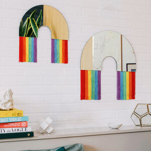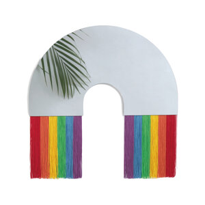 Fresh and contemporary wall mirror with colorful fabric fringes dripping from the rainbow.