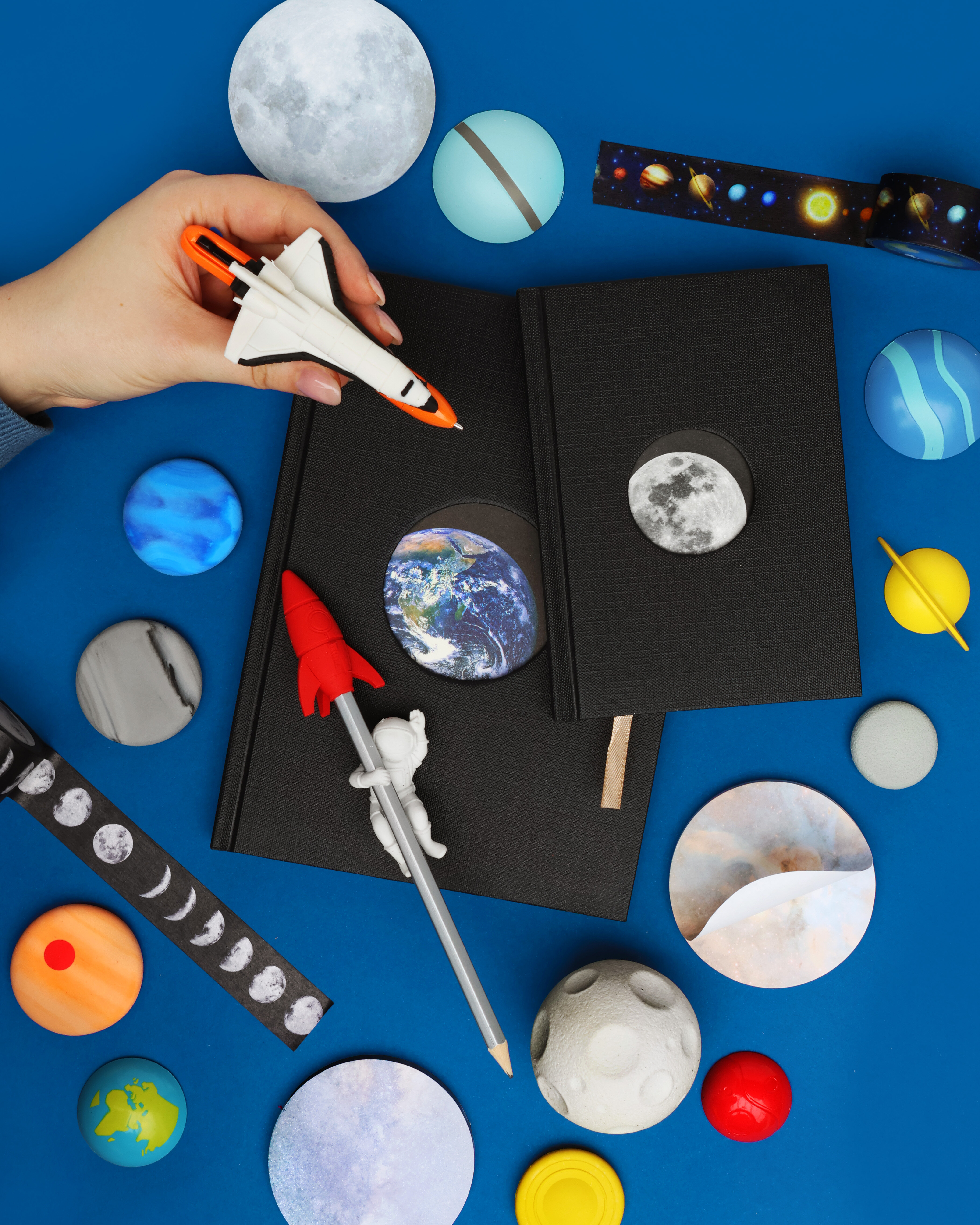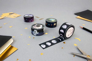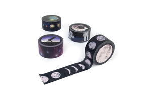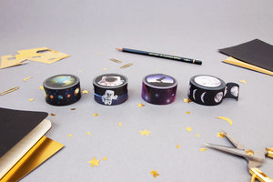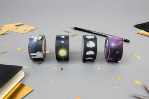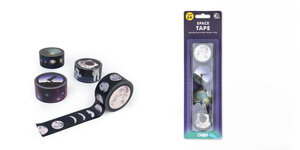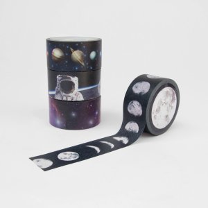 A set of 4 bright and colourful 10m washi tapes. Perfect for wrapping space-age gifts or decorating your science homework. Designs include phases of the moon, constellations, planets and astronauts. Design by Rosie Upright for SUCK UK
