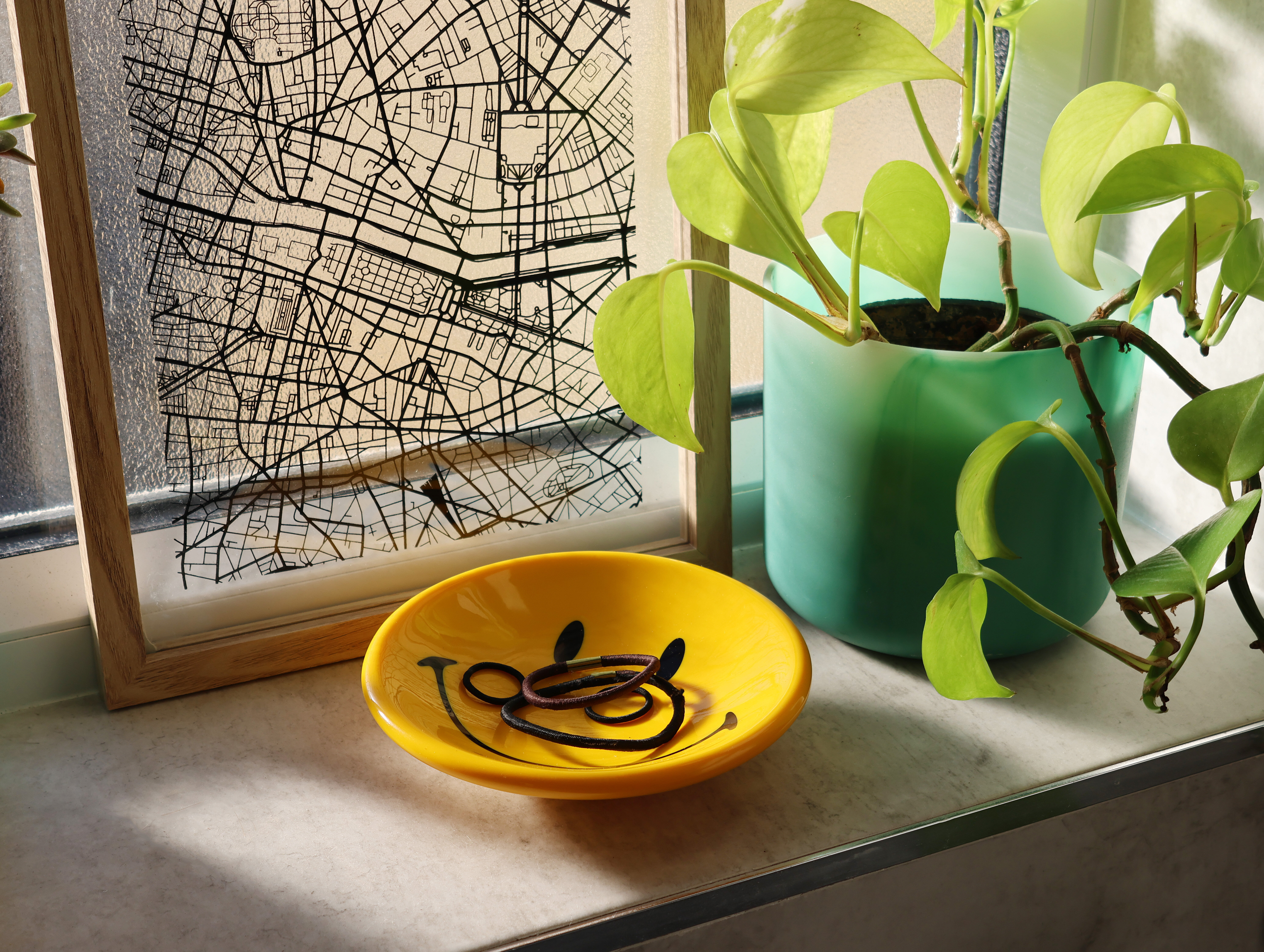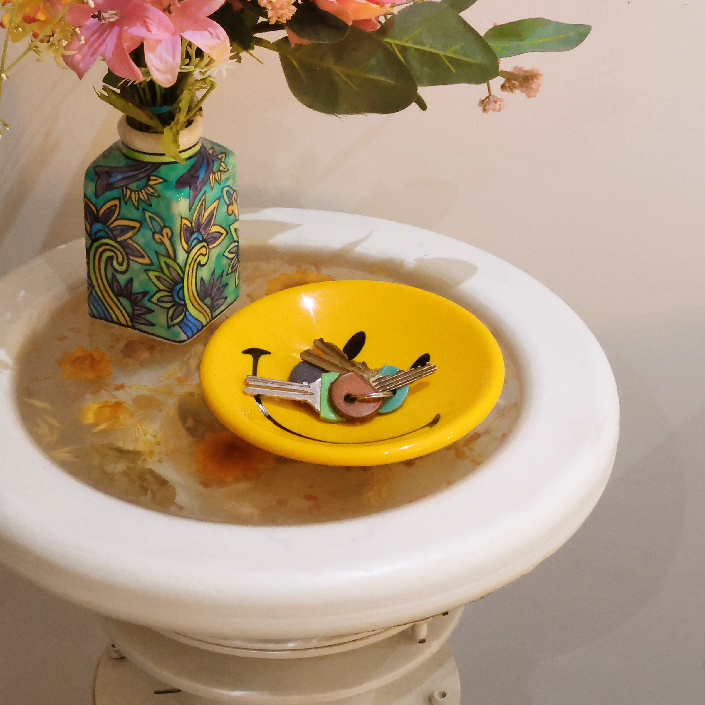 Keys, coins, jewellery, pocket clutter, daily detritus. Dump it all here and let the smiling face take the strain. Bright, glossy and unapologetically cheerfull, it sits by the door doing one job very well: stopping you from losing your mind and your things.